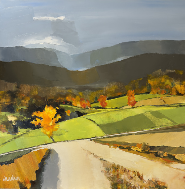 Amoureux des grands espaces et épris de liberté, D. Caudron est aussi pilote de planeur. Ainsi, il aime appréhender les paysages avec un peu de hauteur. Cette distance et cette globalité lui permettent de travailler sur des perspectives lointaines avec des lignes de fuite exacerbées qui rythment la toile. Sans fioriture, il peint ainsi en allant à l’essentiel. Champs vallonnés, petits hameaux nichés au creux des vallées, montagnes lointaines, paysages prismatiques… ses toiles sont des kaléidoscopes de souvenirs et d’émotions.