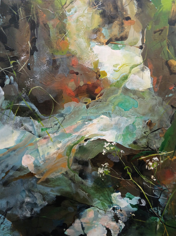 Le temps ne laisse ses traces que sur les fonds. Que ce soit sur du métal oxydé, ou des fonds volontairement craquelés, à base de terre pour les arrimer à la réalité de notre monde, ils contrastent avec le côté lisse de ses personnages. Tour à tour déchirés, grattés, patinés, lumineux…. À l’image de nos vies… et de nos émotions !